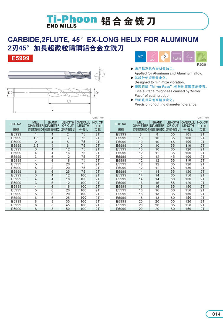 2. 2刃加長鋁合金銑刀 014